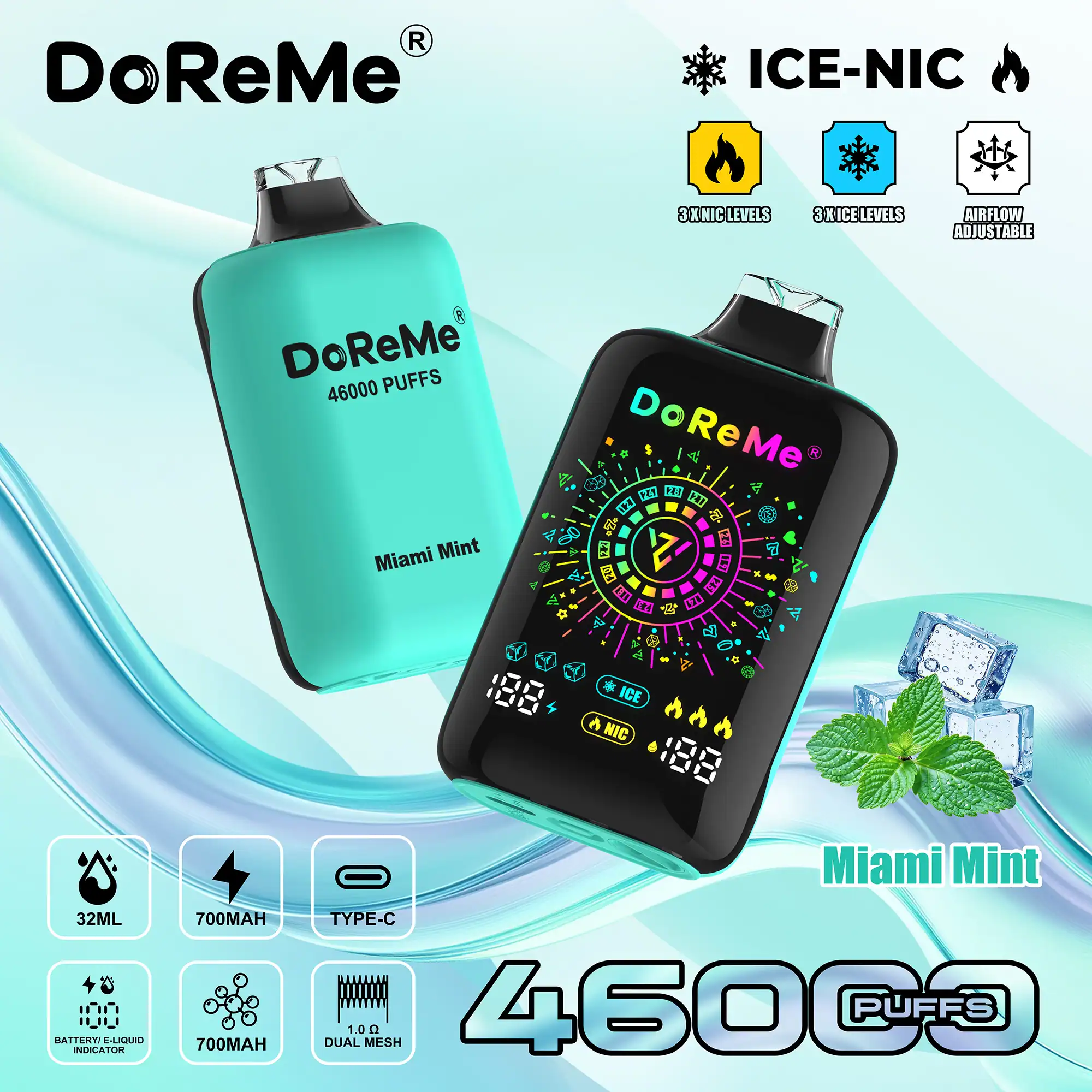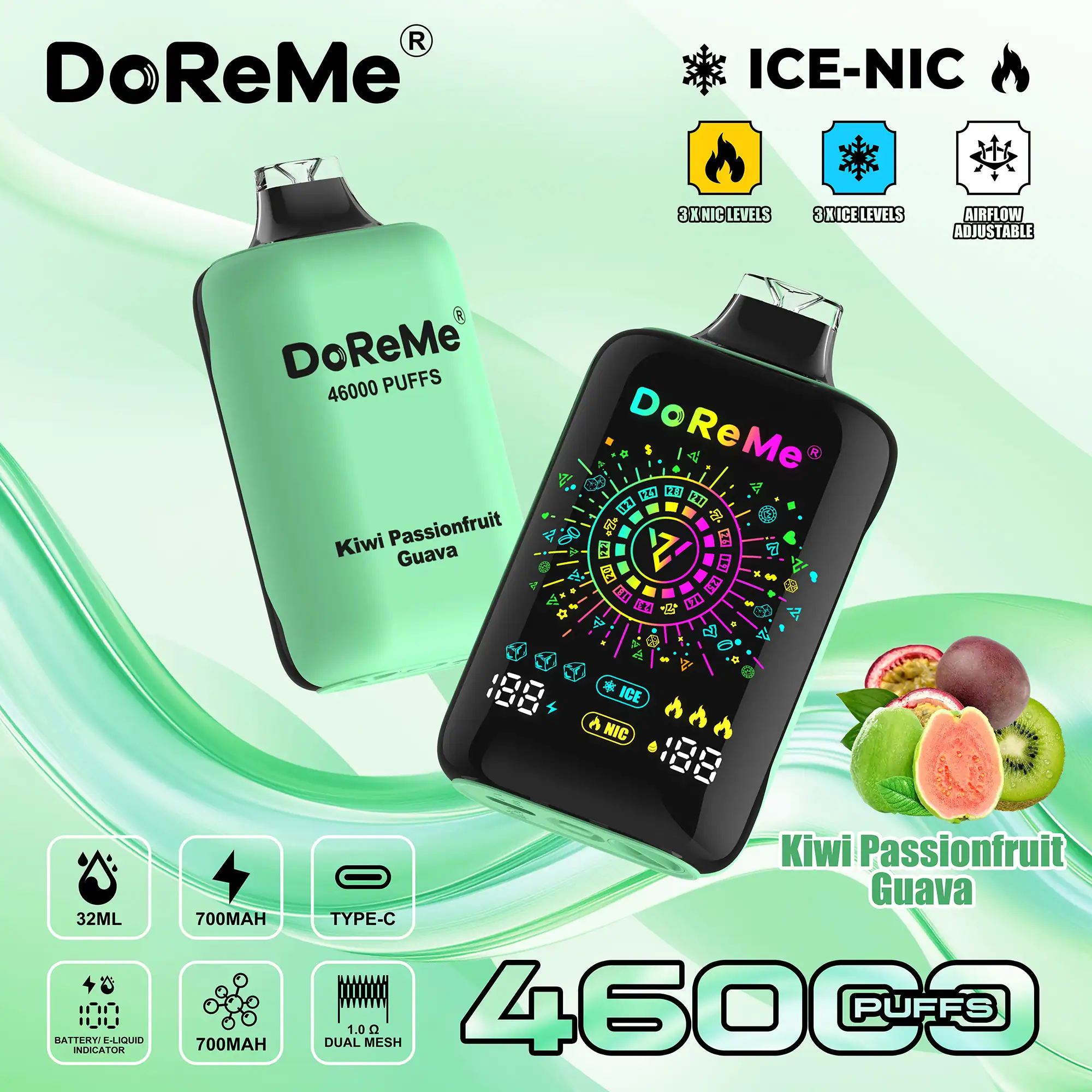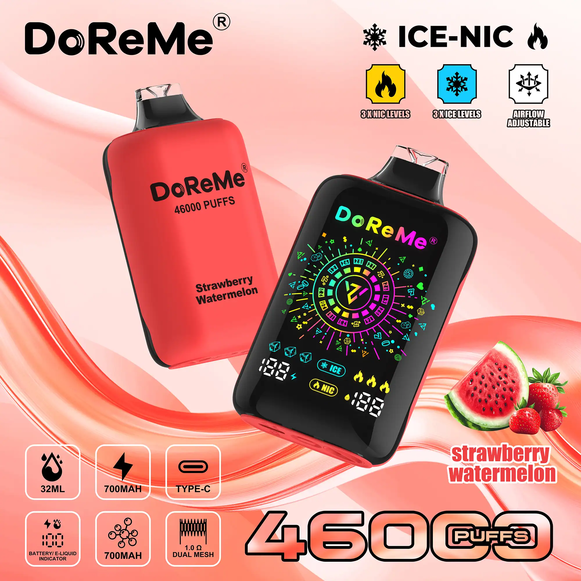 A unique feature of the DoReMe 46000 disposable is its dual indicator system, showing both battery life and e-liquid levels clearly, so users can monitor usage and avoid unexpected power loss or dry hits. The vape incorporates a 1.0Ω dual mesh coil, designed for balanced vapour production and flavour intensity. Additionally, an adjustable airflow system allows customization of the draw and vapor density.