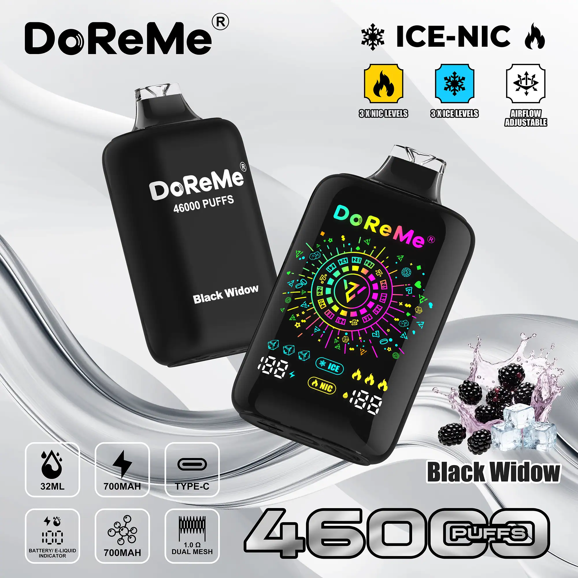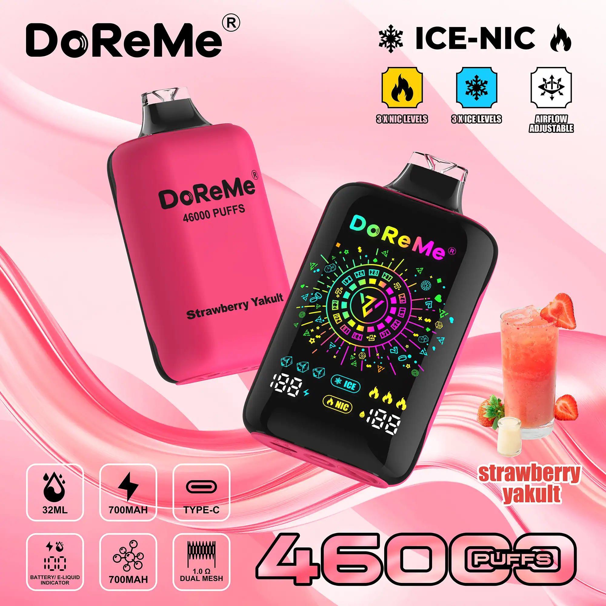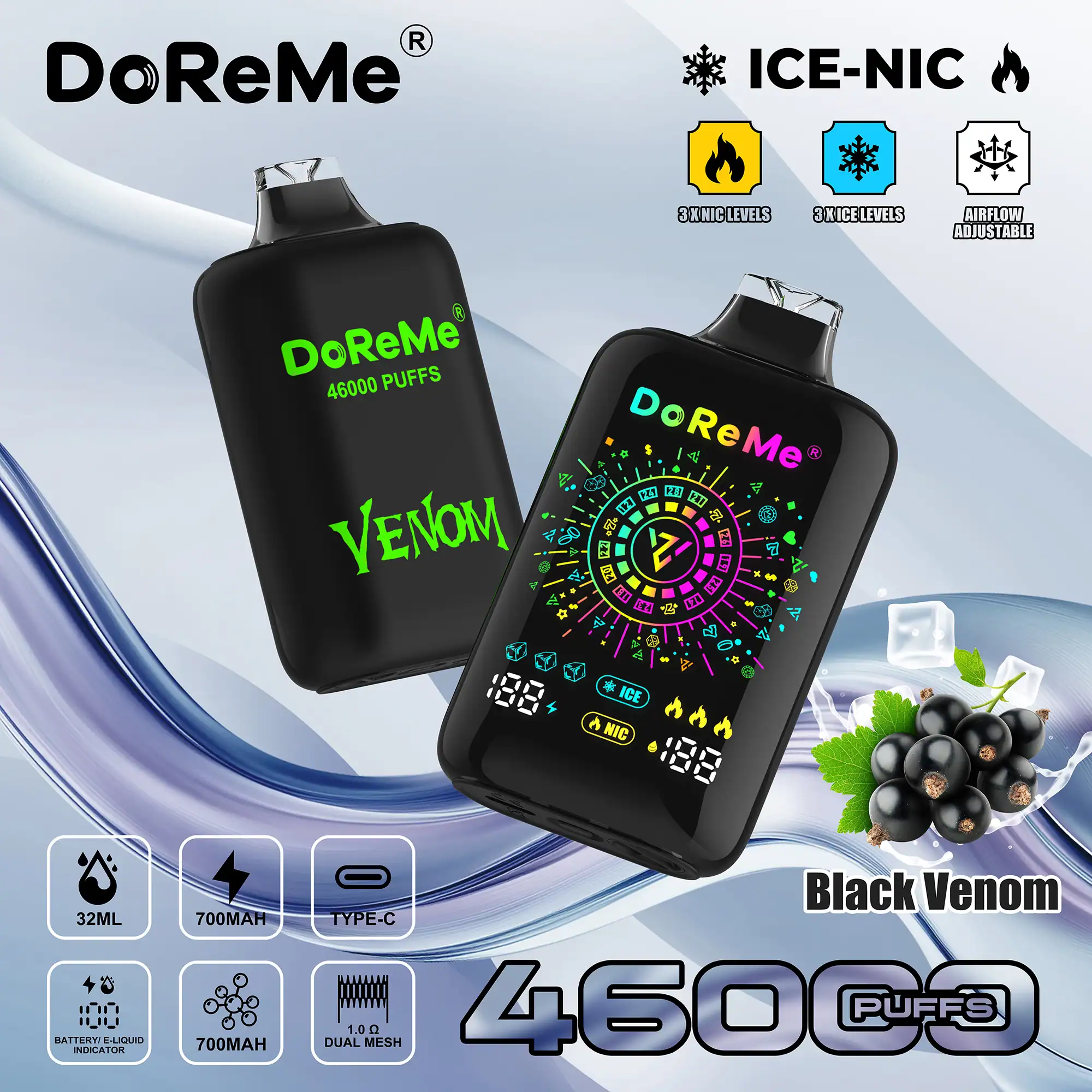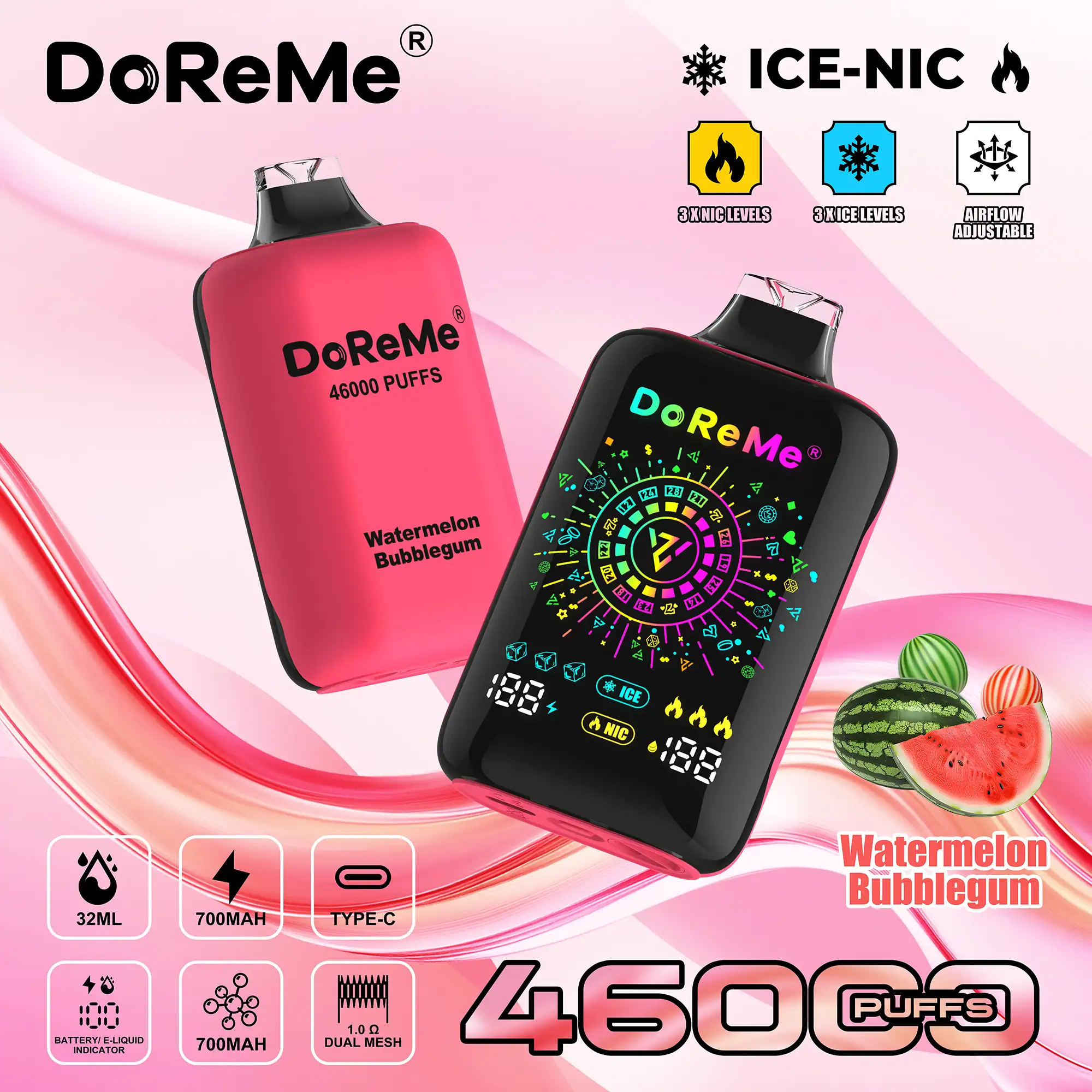 A unique feature of the DoReMe 46000 disposable is its dual indicator system, showing both battery life and e-liquid levels clearly, so users can monitor usage and avoid unexpected power loss or dry hits. The vape incorporates a 1.0Ω dual mesh coil, designed for balanced vapour production and flavour intensity. Additionally, an adjustable airflow system allows customization of the draw and vapor density.