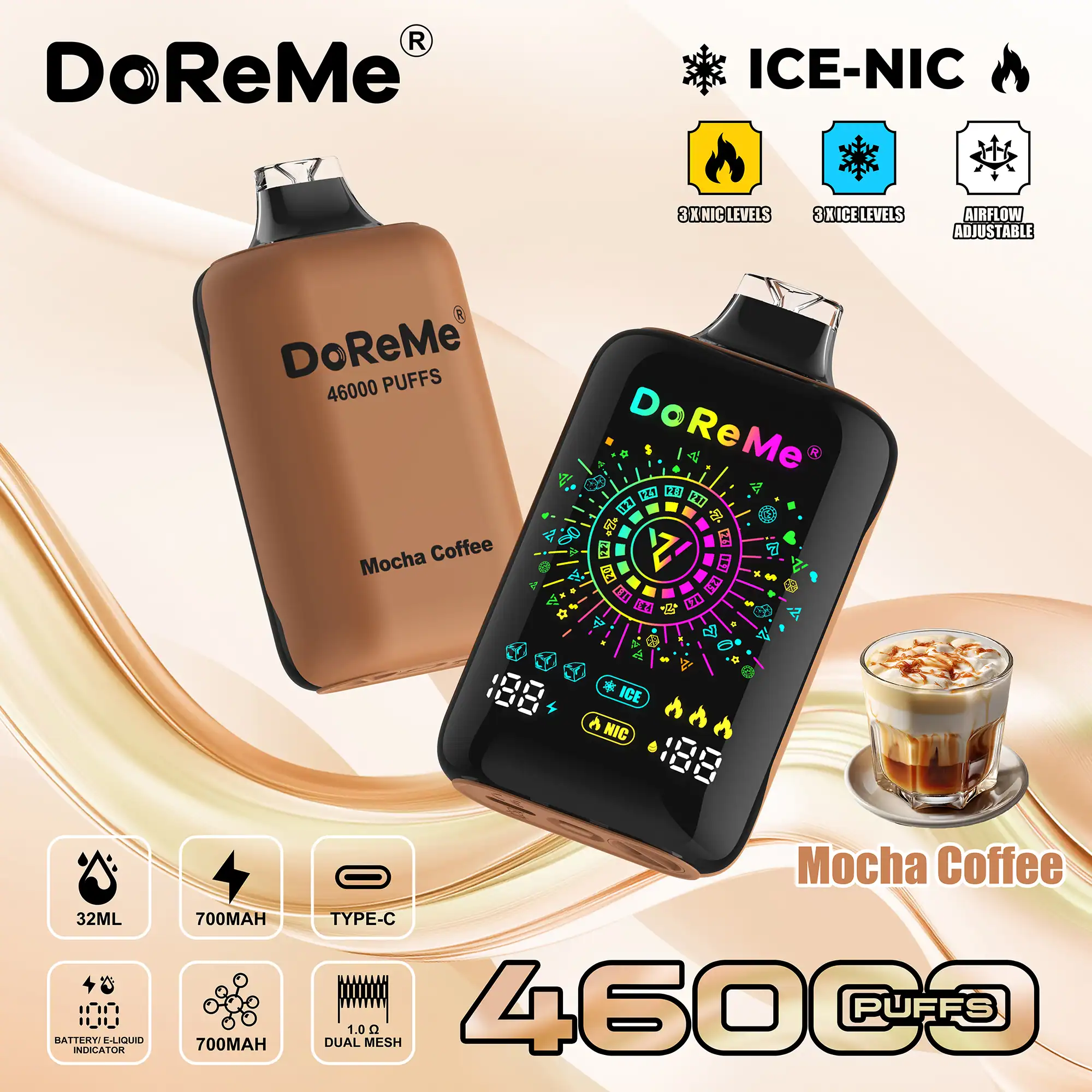 Perfect for vapers seeking a hassle-free, long-lasting disposable option with premium flavour, the DoReMe 46000 Puffs in Mocha Coffee is your ideal companion.